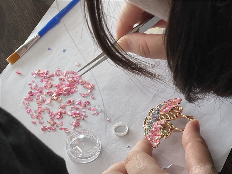 三、粘贴螺钿:用镊子夹取螺钿碎片或粉末,小心地将其粘贴在涂有胶水的底托上。可以根据设计和个人喜好,选择不同颜色和形状的螺钿进行粘贴,创造出独特的图案。