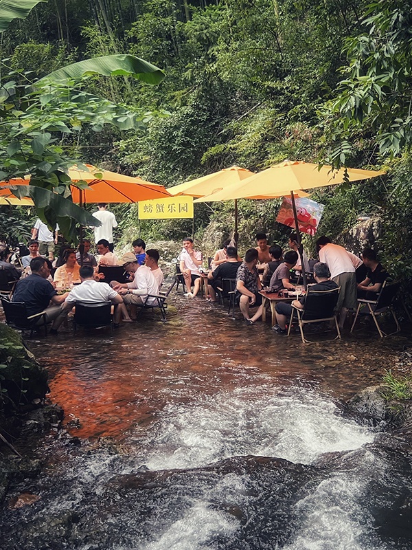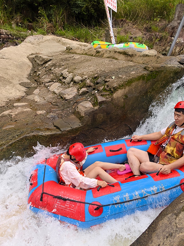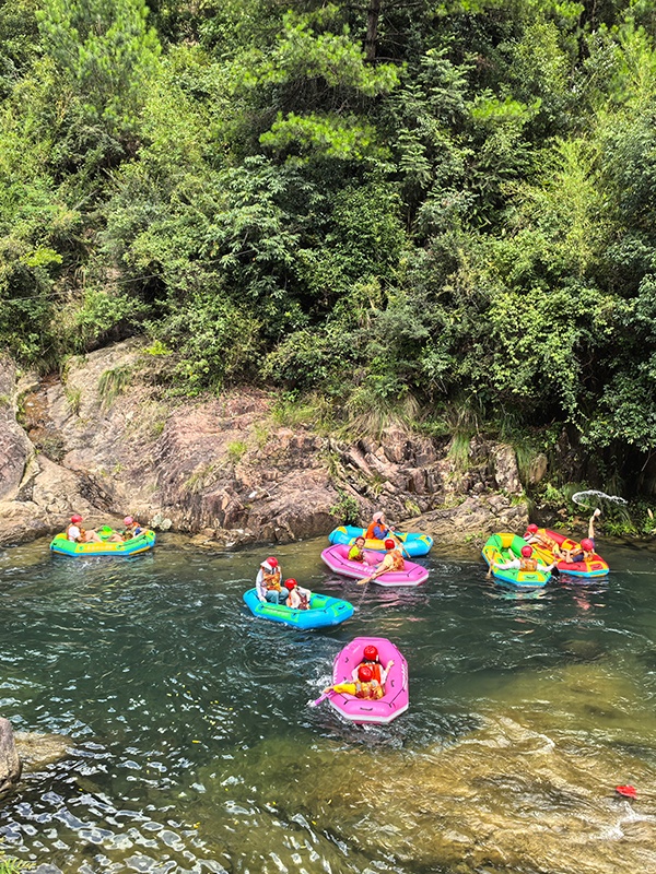 午餐过后,最让人期待的深溪峡谷漂流即将登场。2.8 公里的漂流河道,藏着近百米的落差,70% 的激流段让心跳全程加速。坐上皮筏艇,时而在湍急的河滩上飞驰,看浪花飞溅打湿衣衫;时而坠入碧绿的深潭,在悠悠波光里欣赏两岸层峦叠嶂的倒影。大小落差十多处,每一处都是不同的惊喜,员工们并肩作战,尖叫与欢笑齐飞,在 22℃的山泉水里体验 “速度与激情”,也收获了并肩同行的珍贵情谊。