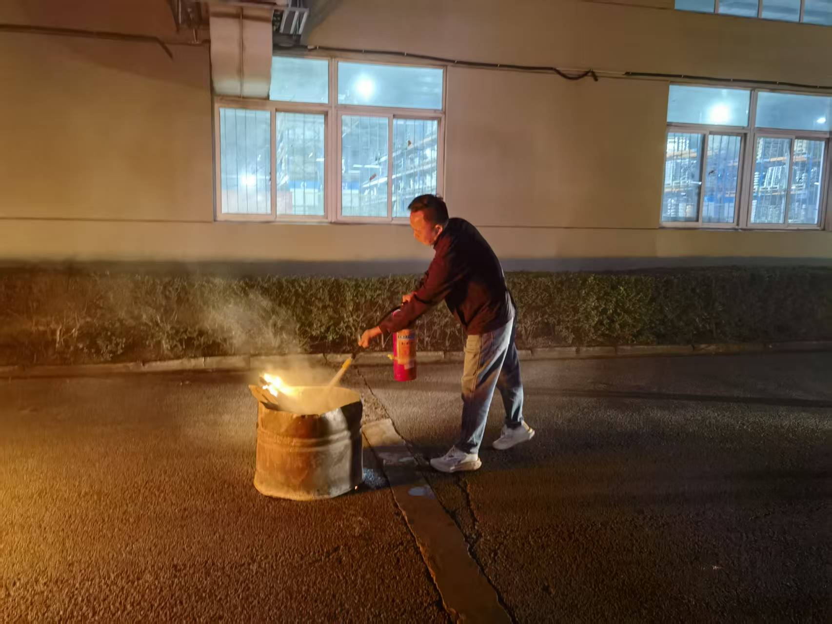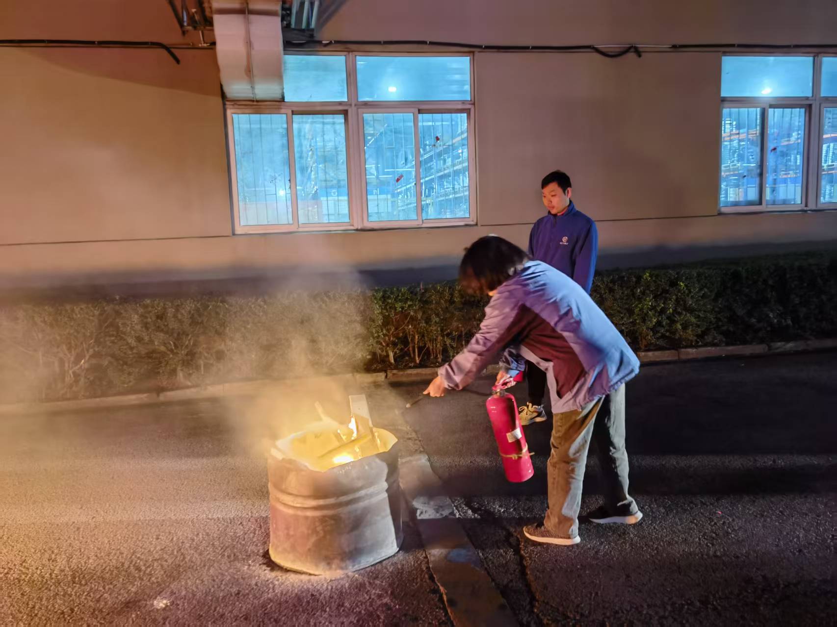 三、初起火灾扑救实操演练:疏散完成后,应急小组针对模拟火源开展实操,重点演练夜间暗光环境下灭火器的快速取用、正确握持及“提、拔、握、压”灭火流程;