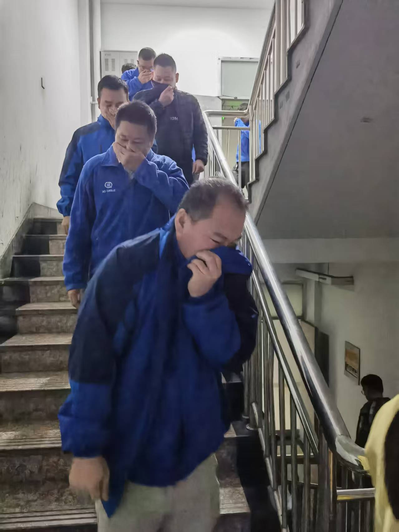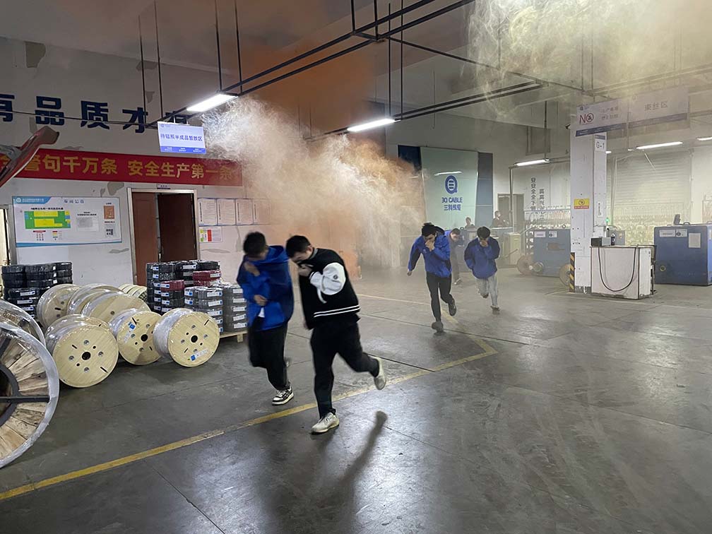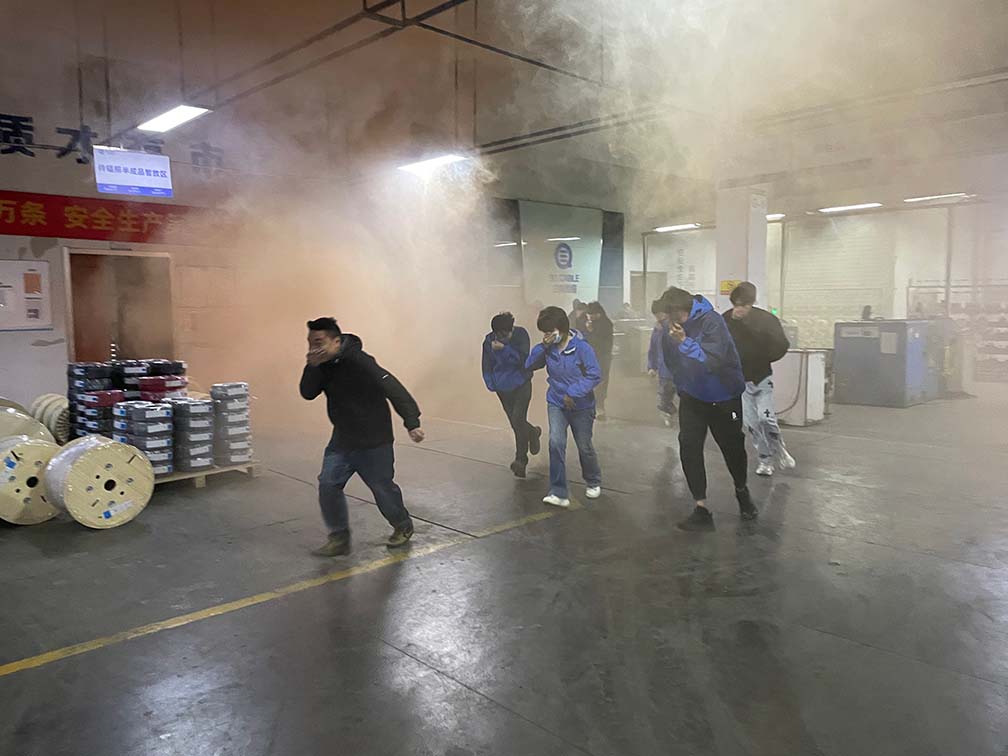 一、夜班车间火灾疏散逃生演练:车间二楼因模拟设备线路短路“起火”,浓烟顺着楼梯间向下蔓延,夜班员工在疏散引导员指引下,弯腰捂鼻从二楼撤至紧急集合点;