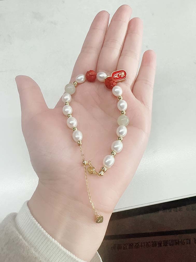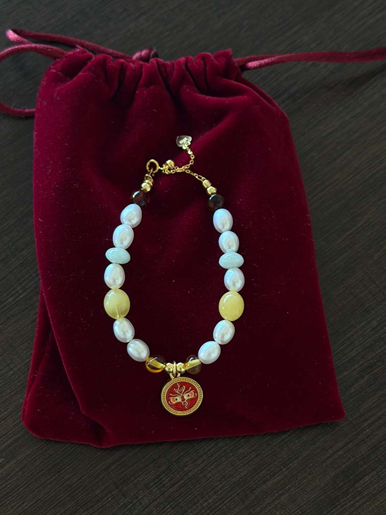 指尖翻飞间,原本零散的珍珠与配件逐渐成型:搭配银质小吊坠的亲子款手串温馨动人,点缀淡水珠的简约款适合日常佩戴,融入彩宝的设计则更添个性张力。不少同事一边制作,一边分享穿搭心得,现场不时传来对珍珠光泽的赞叹,手作的乐趣在空气中悄然流淌。大家完成作品后,立刻戴上自己的专属手串,对着镜头记录这份满满的成就感。